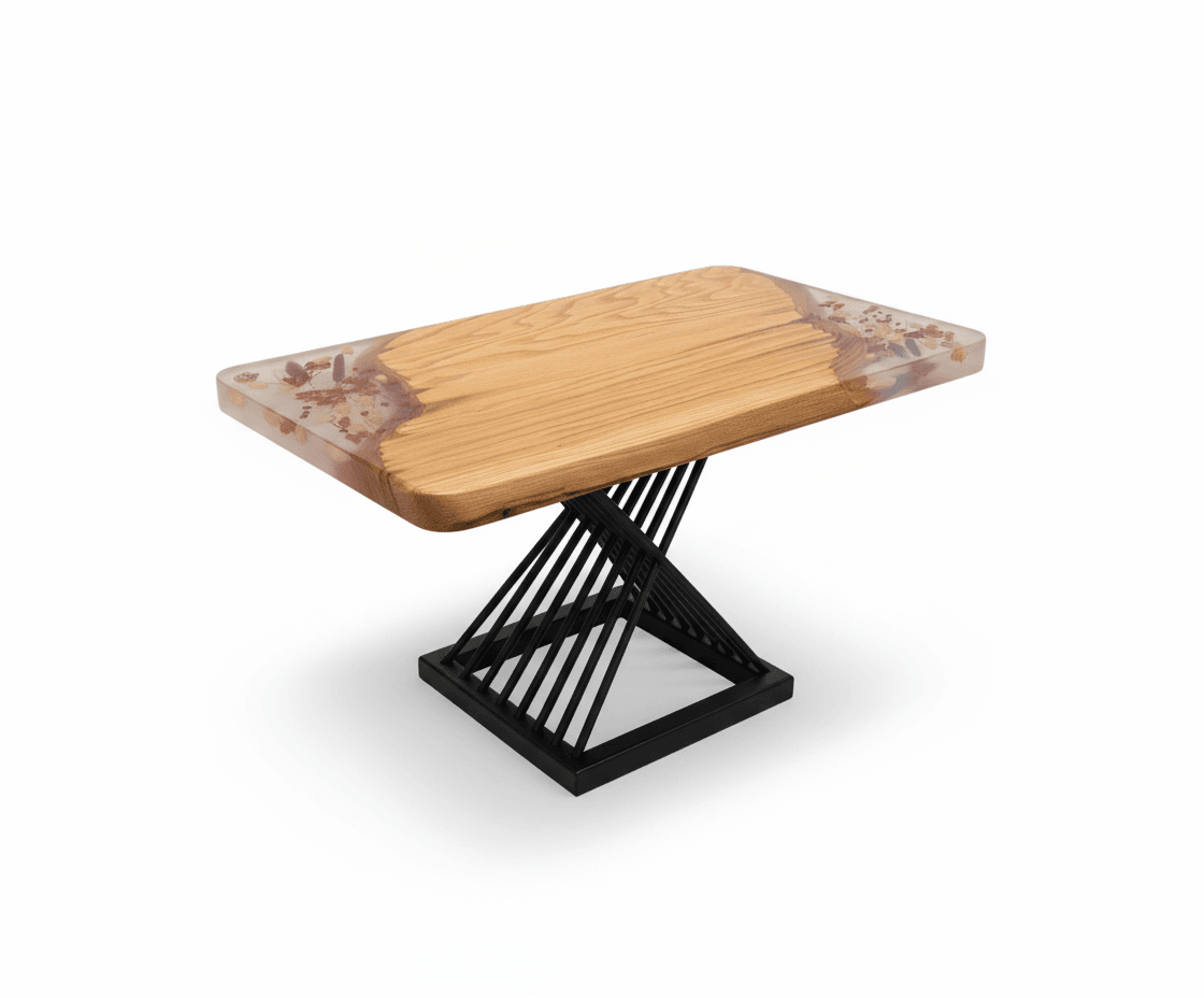 Ten stół to połączenie funkcjonalności z estetyką, które od razu przyciąga wzrok. Jego organiczna forma, szlachetne drewno i subtelnie zatopione kwiaty sprawiają, że stanie się głównym punktem Twojego wnętrza – meblem, który łączy nowoczesność z naturą.