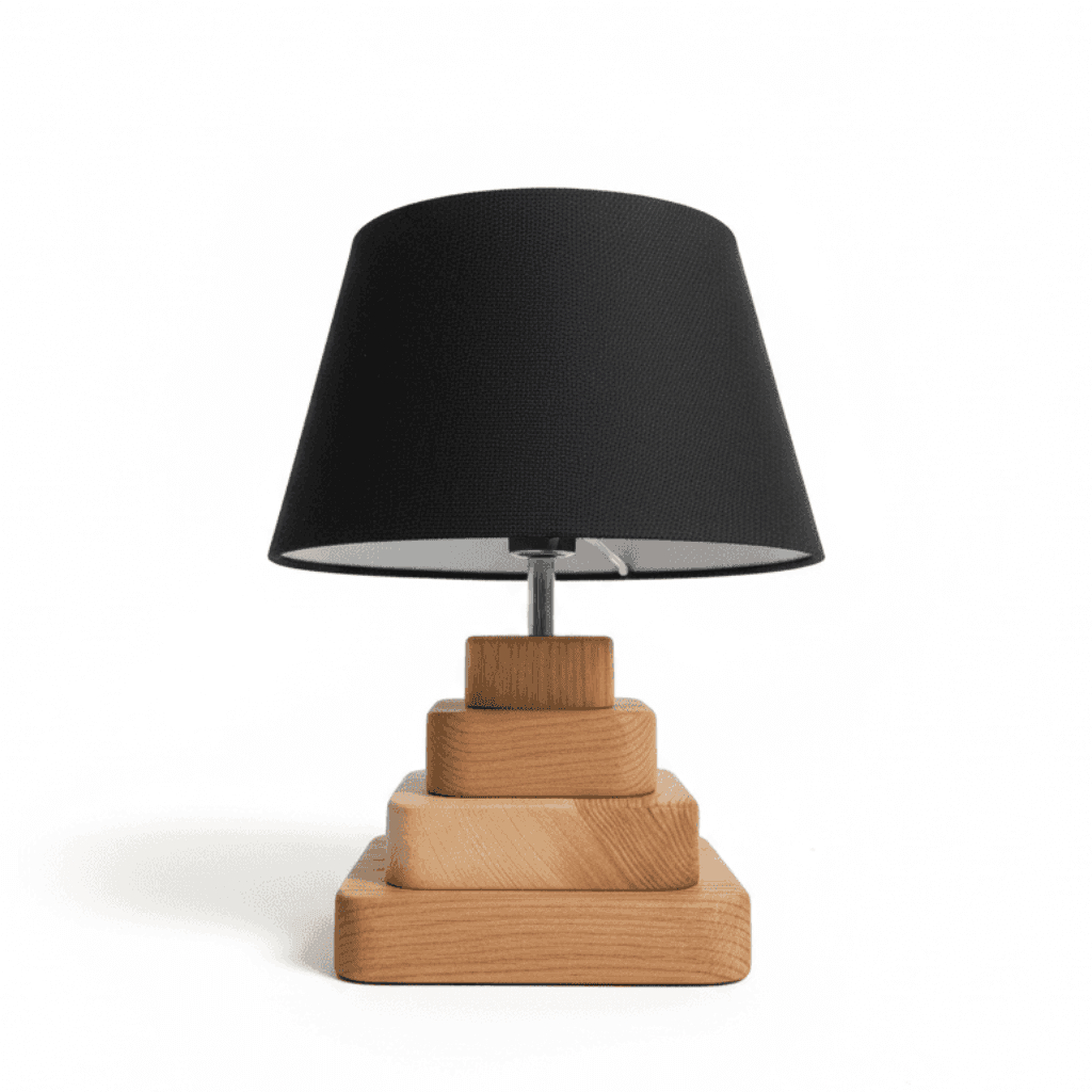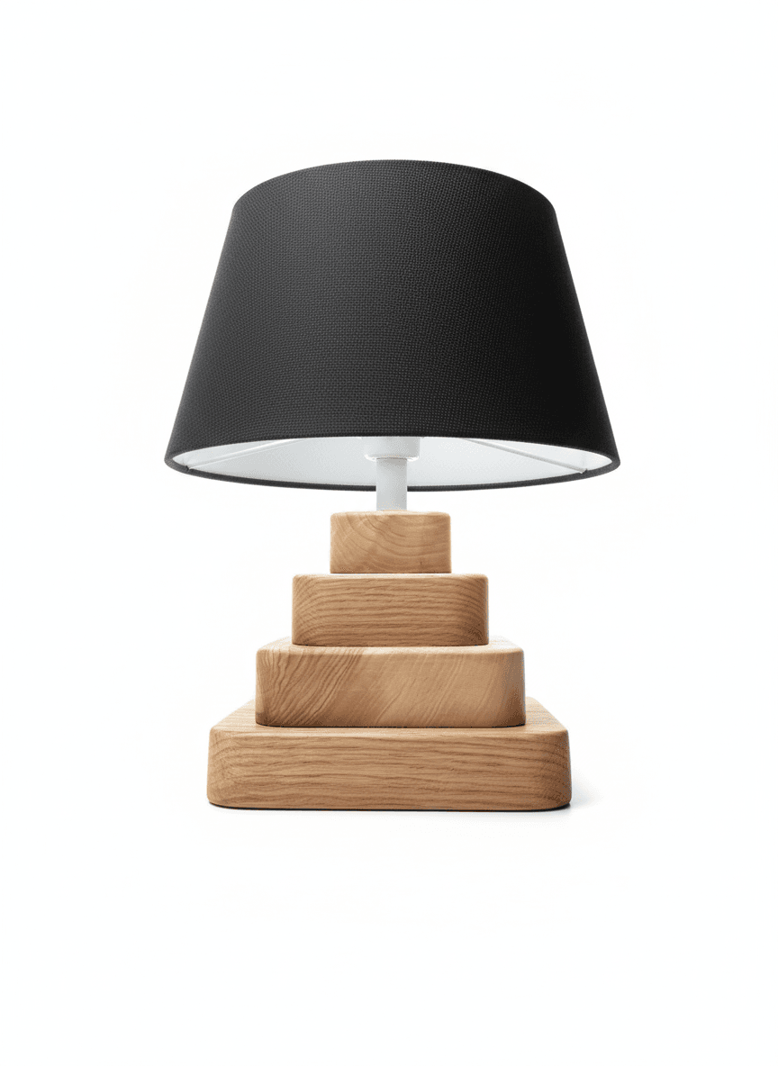 Lampka „Dębowa Piramida” to eleganckie połączenie naturalnego litego dębu z nowoczesnym, czarnym kloszem. Jej charakterystyczna, schodkowa podstawa inspirowana geometryczną formą nadaje lampce unikalny wygląd, który przyciąga wzrok i podkreśla prestiż wnętrza.