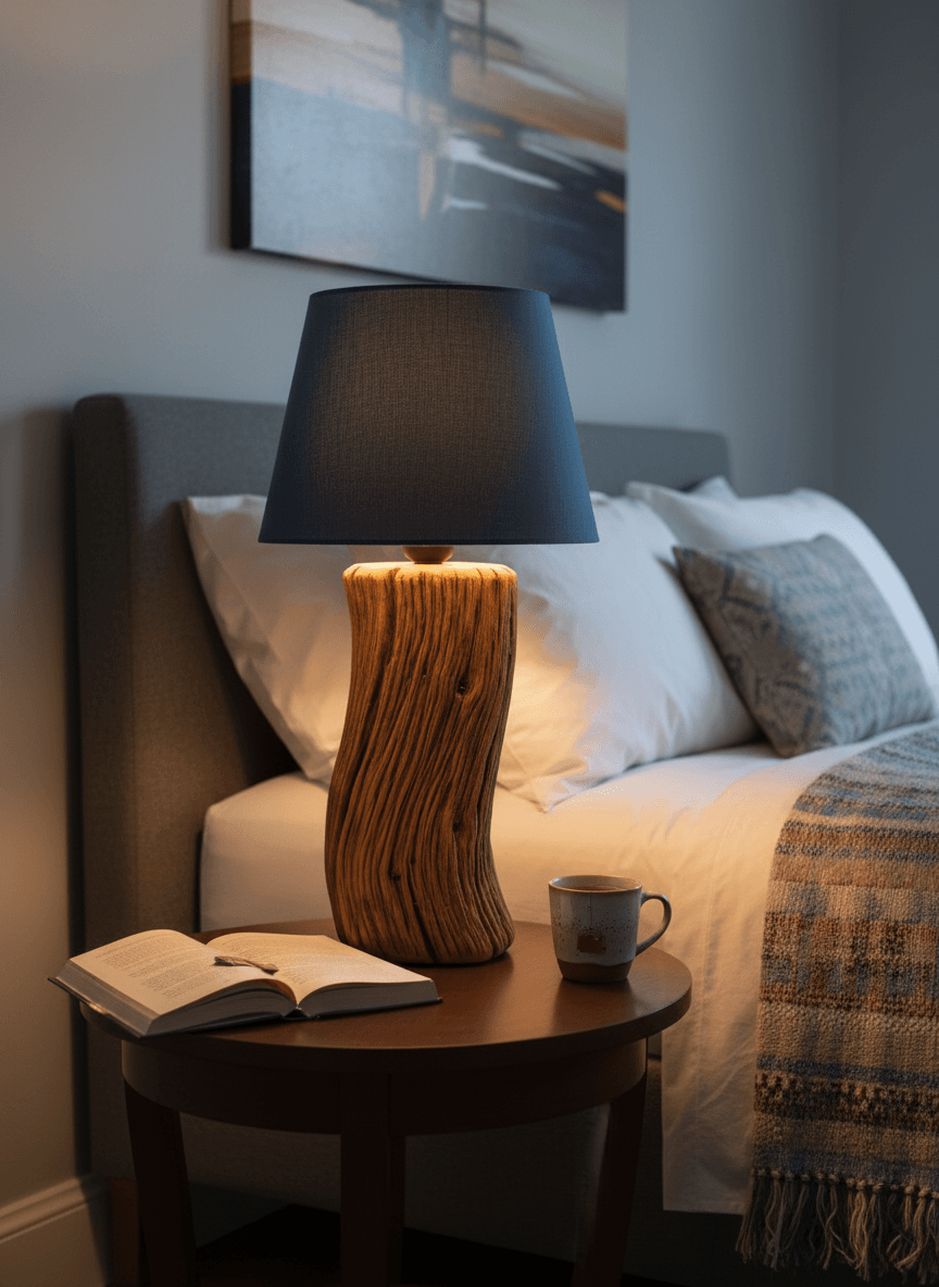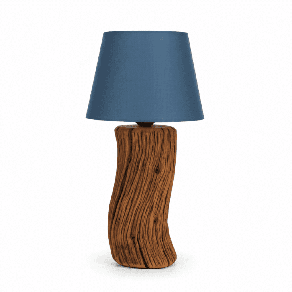 Lampka posiada stylowy niebieski klosz, który delikatnie rozprasza światło, tworząc przyjemną i harmonijną atmosferę. Połączenie ciepłego drewna jabłoni z chłodnym odcieniem klosza daje efekt równowagi i elegancji — sprawia, że „Niebieska Aura” doskonale wpisuje się w styl skandynawski, nowoczesny, klasyczny, eco czy boho.