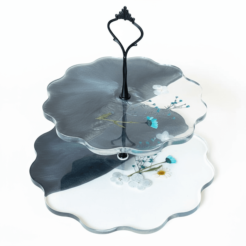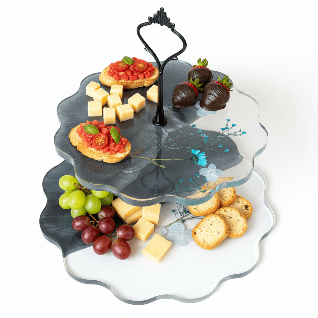 Odkryj ponadczasową klasę w nowoczesnej formie dzięki dwupoziomowej paterze z żywicy epoksydowej. Jej głęboka, czarna kolorystyka z efektem cieniowania i połysku nadaje każdej przestrzeni elegancki charakter. To ręcznie wykonany dodatek, który doskonale sprawdzi się zarówno podczas przyjęć, jak i w codziennym użytkowaniu.