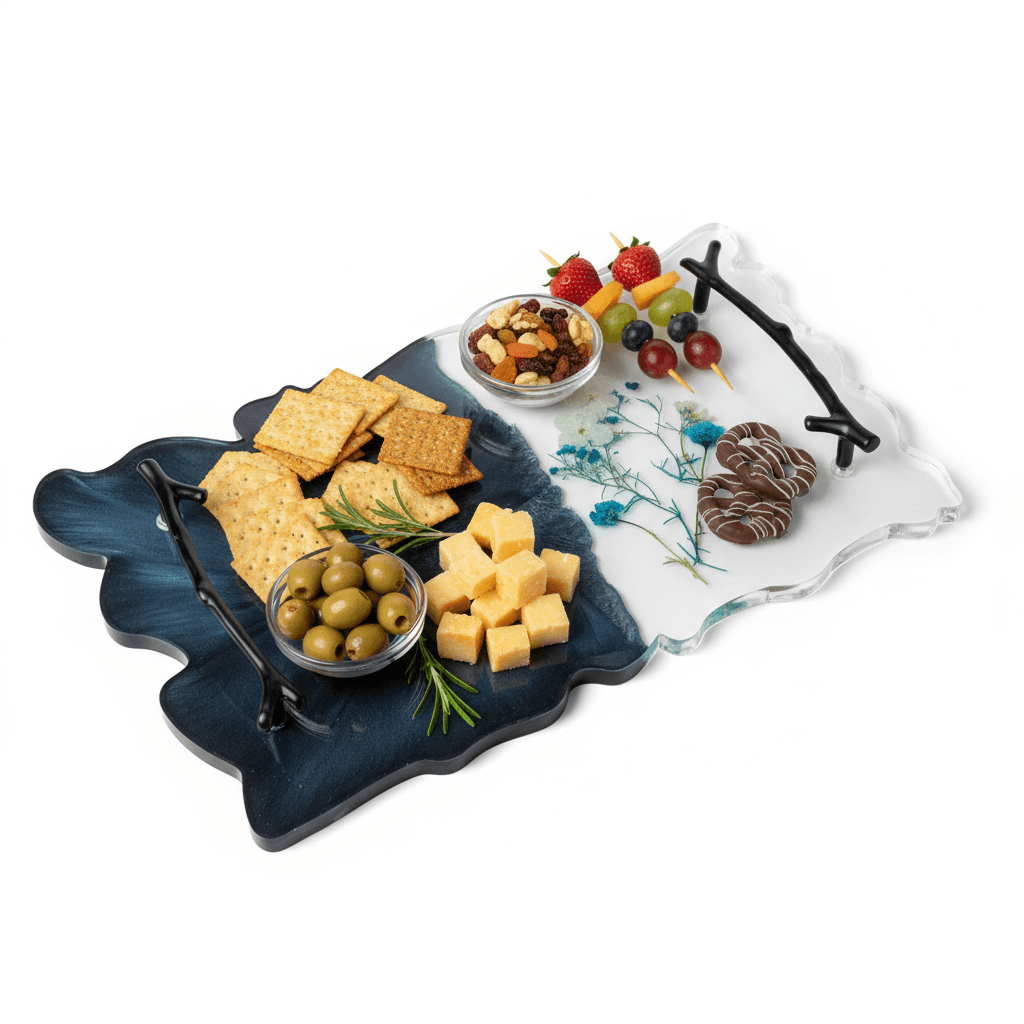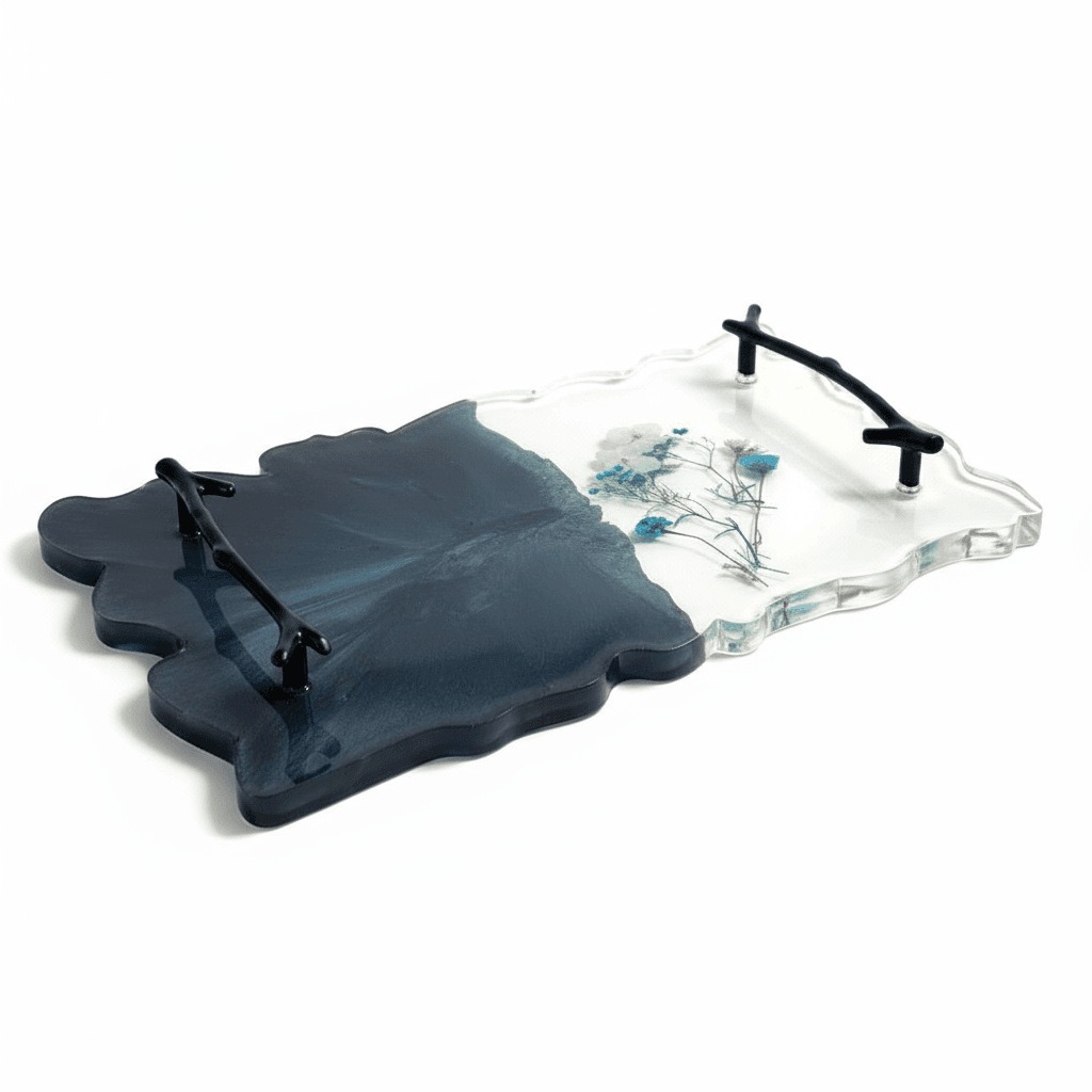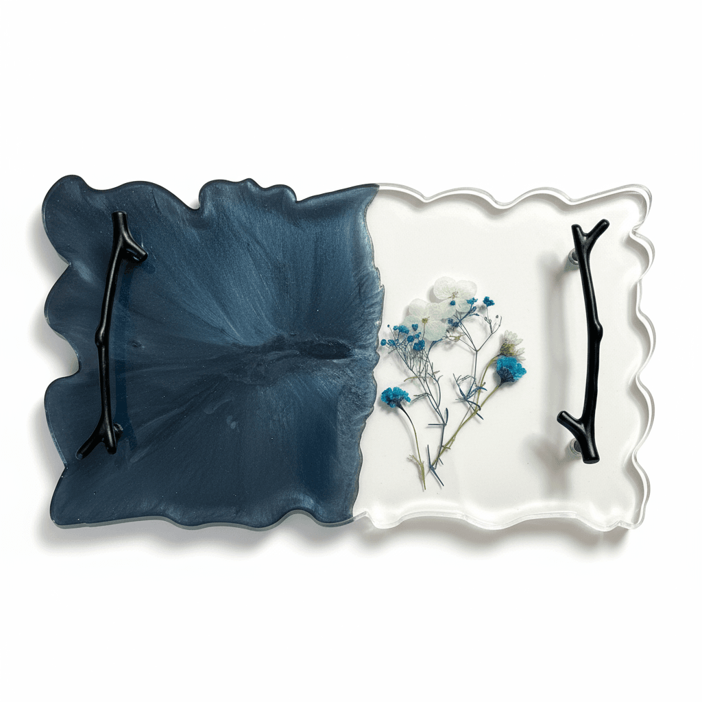 Oto niepowtarzalna taca z żywicy epoksydowej, która zachwyca subtelną, lodową barwą i wyjątkowym detalem w postaci czarnych uchwytów w kształcie gałęzi. To połączenie nowoczesnego designu i inspirowanej naturą estetyki, które sprawia, że produkt idealnie sprawdzi się zarówno jako użytkowy element wnętrza, jak i unikalna dekoracja.