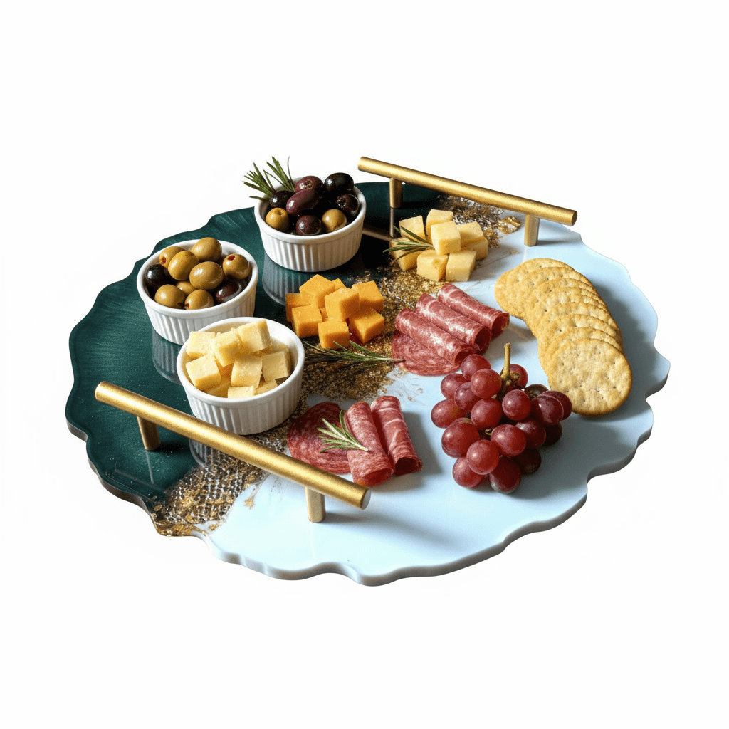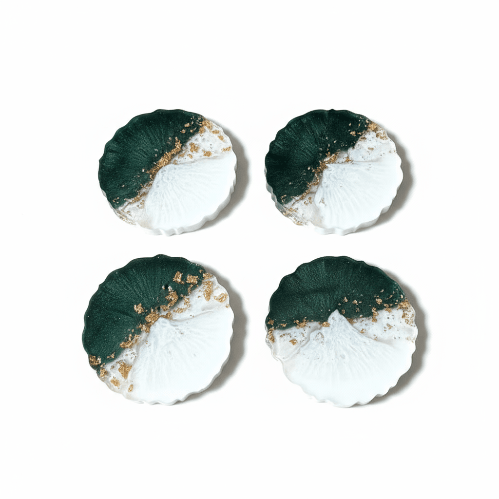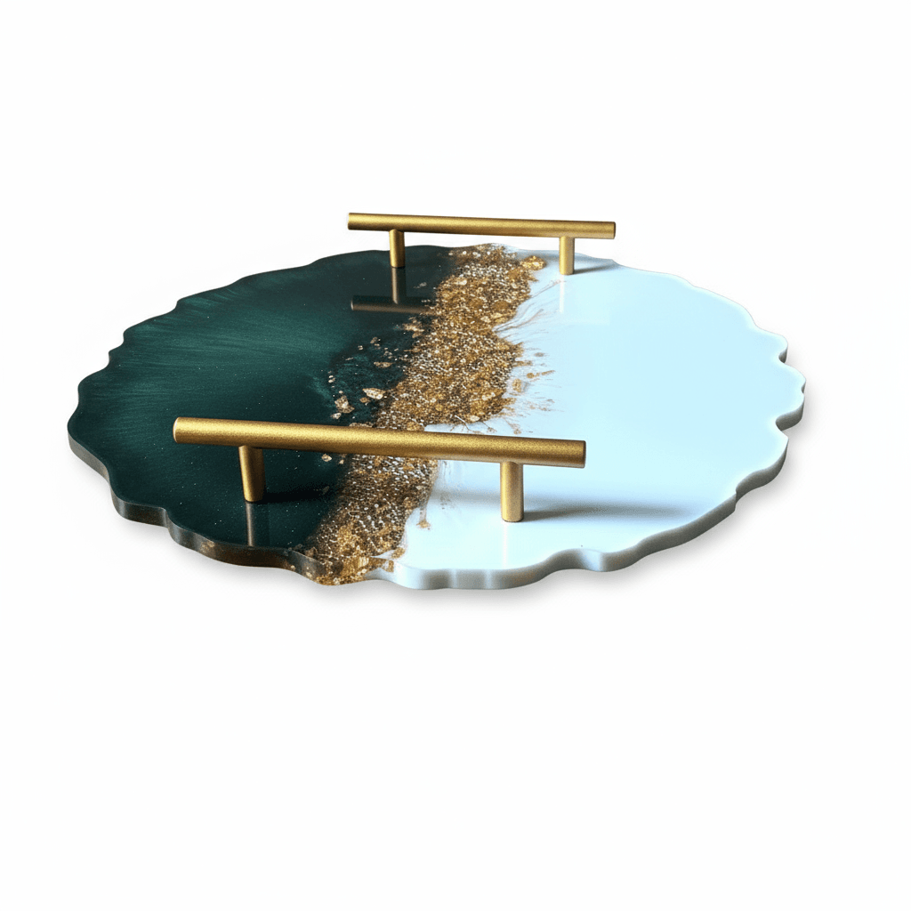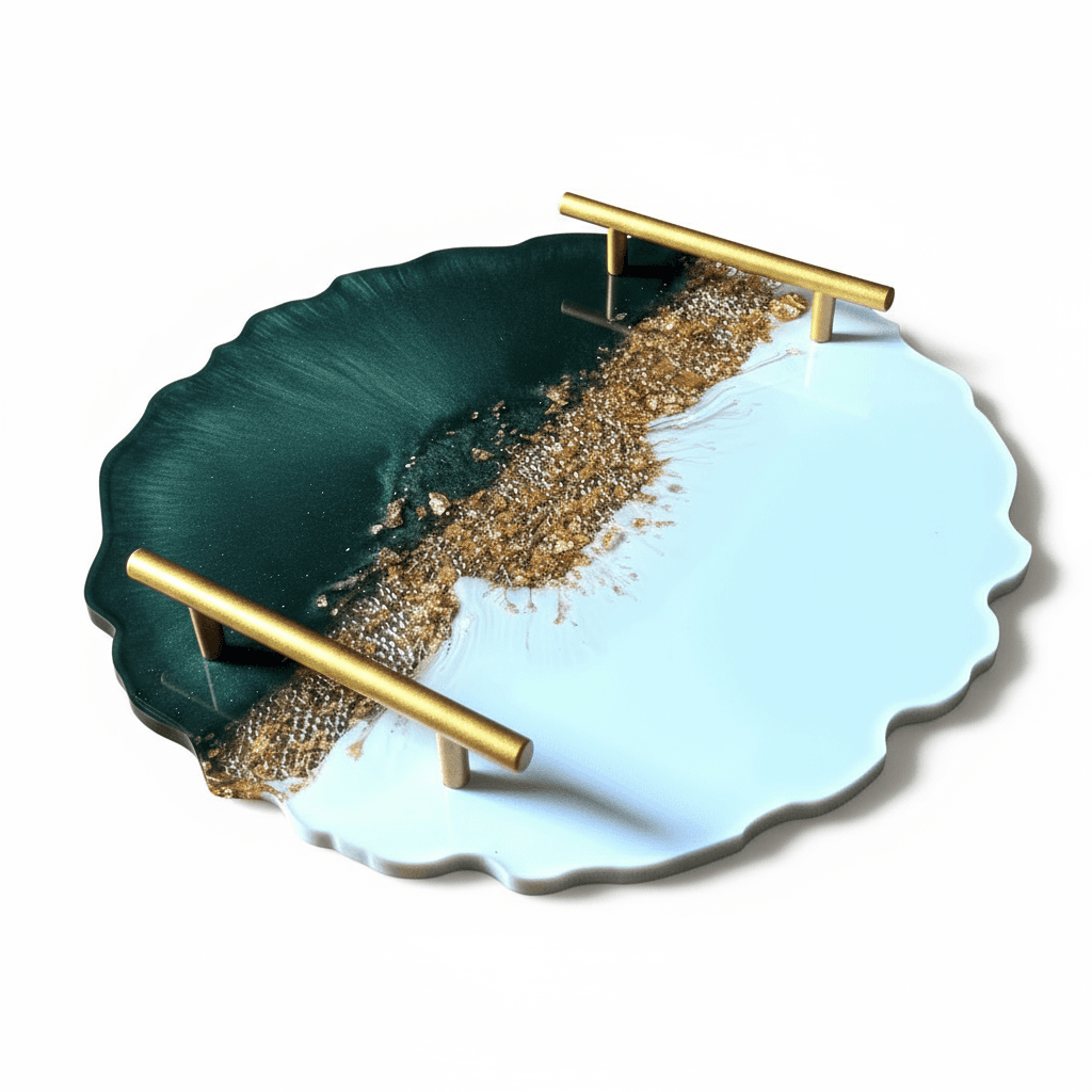 Wprowadź do swojego wnętrza odrobinę luksusu dzięki unikalnemu zestawowi z żywicy: dekoracyjnej tacy z uchwytami i czterech podstawek pod kubki. Ręcznie wykonane, o artystycznym wzorze i z dodatkiem złotych akcentów, stanowią nie tylko praktyczny element wyposażenia, ale również wyjątkową ozdobę każdego stołu. Połączenie głębokiej zieleni, bieli oraz złota tworzy elegancki kontrast, który przyciąga uwagę i dodaje klasy każdemu wnętrzu.