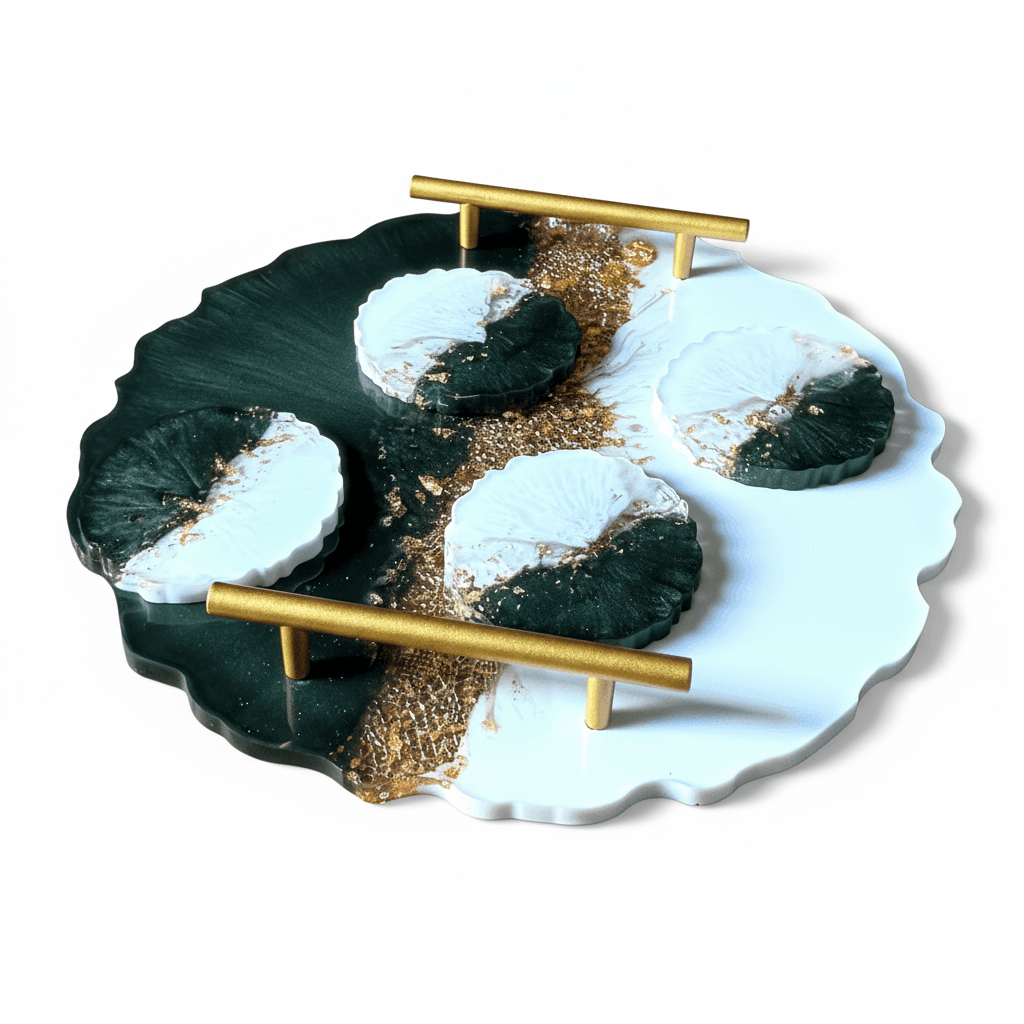 Taca z żywicy + 4 podstawki pod kubki – „Szlachetny Zielony”Produkt dostępny na zamówienie